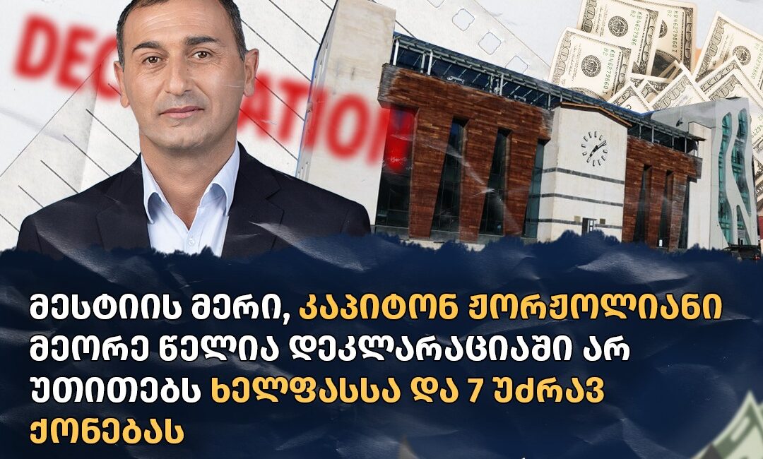 - მესტიის მუნიციპალიტეტის მერი, კაპიტონ ჟორჟოლიანი 2024 წლის თებერვალში შევსებულ ქონებრივ დეკლარაციაში საკუთარ ქონებას, ასევე შრომის ანაზღაურებიდან მიღებულ შემოსავალს მალავს. ამის შესახებ ინფორმაციას “საერთაშორისო გამჭვირვალობა – საქართველო” აქვეყნებს.