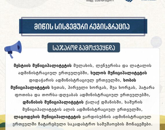 მიწის სისტემური რეგისტრაციის ფარგლებში, მესტიის, ხულოს, ხობის, დმანისისა და ლაგოდეხის მუნიციპალიტეტების ადმინისტრაციულ ერთეულებში ჩატარებული საკადასტრო სამუშაოების მონაცემები საჯაროდ გამოქვეყნდა. მონაცემების გაცნობა შესაძლებელია საჯარო რეესტრის ეროვნული სააგენტოს ოფიციალურ ვებგვერდზე www.napr.gov.ge , www.slr.napr.gov.ge მესტიის მუნიციპალიტეტის ოფიციალურ ვებგვერდზე https://mestia.gov.ge მესტიის მუნიციპალიტეტის მერიის შენობაში, ადმინისტრაციული ერთეულების: მულახის, ლენჯერისა და ლატალის ადმინისტრაციულ შენობებში. ასევე, იუსტიციის...